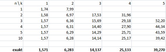 Für die Parameterkonstrellation E=L=ρ=1 stellt die folgend abgebildete Tabelle die Näherungslösungen fk(n) für Modelle mit unterschiedlicher Anzahl von Elementen (n) den exakten Werten gegenüber.